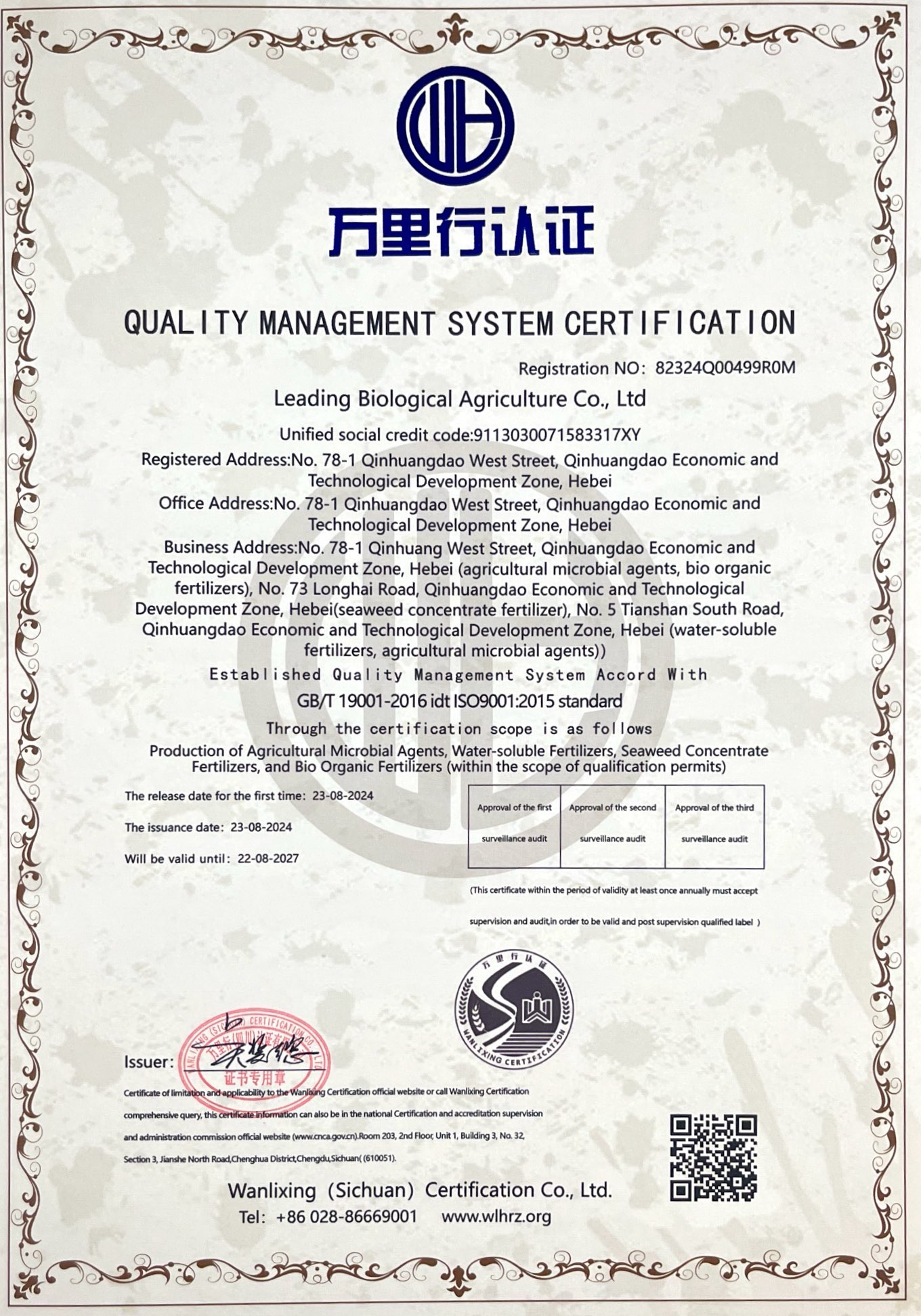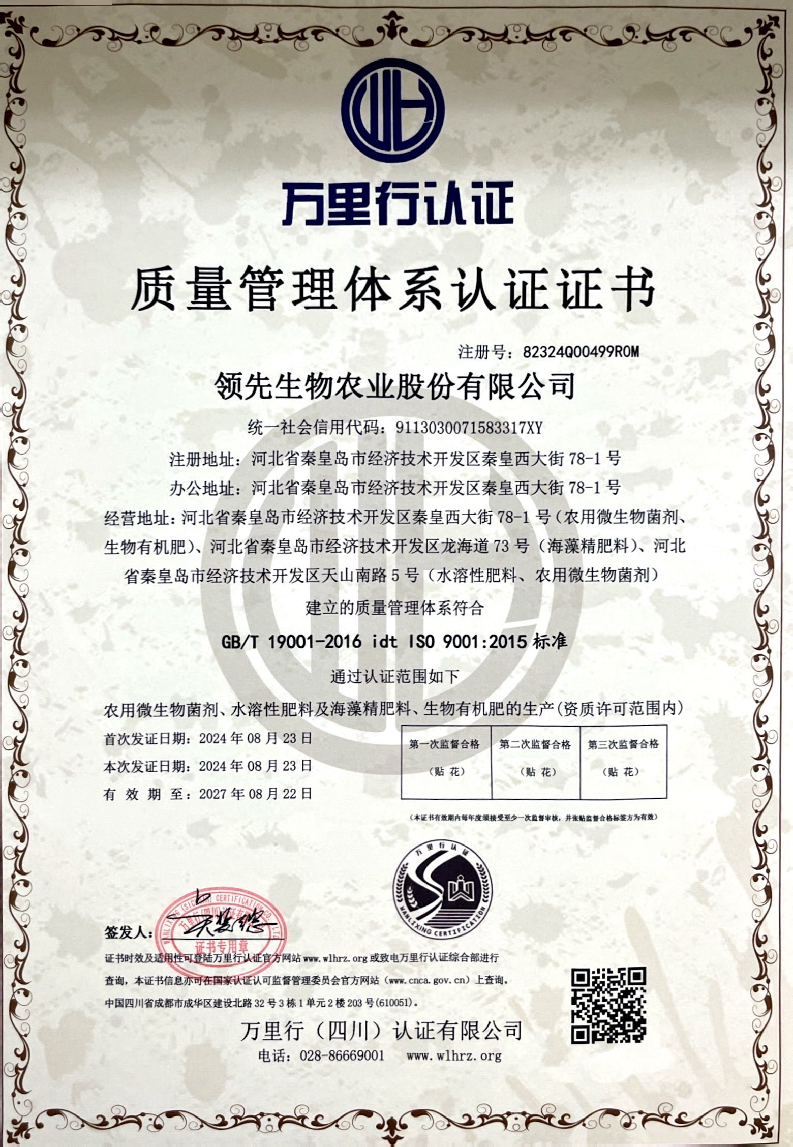 质量治理系统认证证书