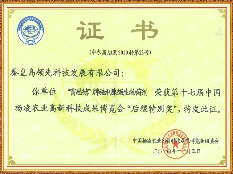 “富思德”牌施利康微生物菌剂—第十七届中国杨凌农博会“后稷特殊奖”